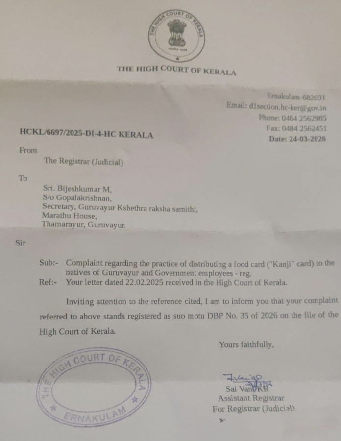 2025 ഫെബ്രുവരി 22-ന് സമർപ്പിച്ച ഈ പരാതിയെ അടിസ്ഥാനമാക്കി ഹൈക്കോടതി suo motu DBP നമ്പർ 35/2026 ആയി കേസ് രജിസ്റ്റർ ചെയ്തതായി രജിസ്ട്രാർ (ജുഡീഷ്യൽ) ഓഫീസ് അറിയിച്ചു. കേസുമായി ബന്ധപ്പെട്ട ഔദ്യോഗിക അറിയിപ്പ് പരാതിക്കാരന് കൈമാറിയതായും സ്ഥിരീകരിച്ചിട്ടുണ്ട്.